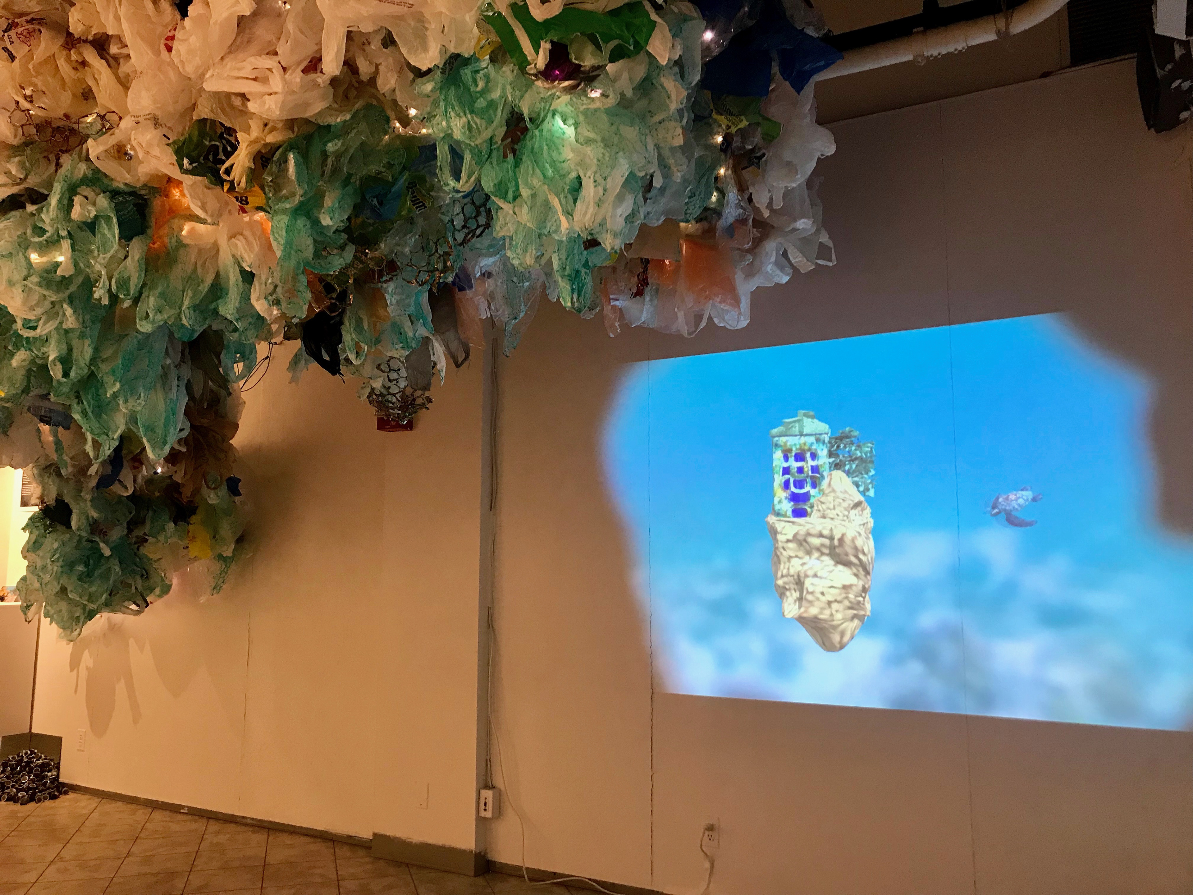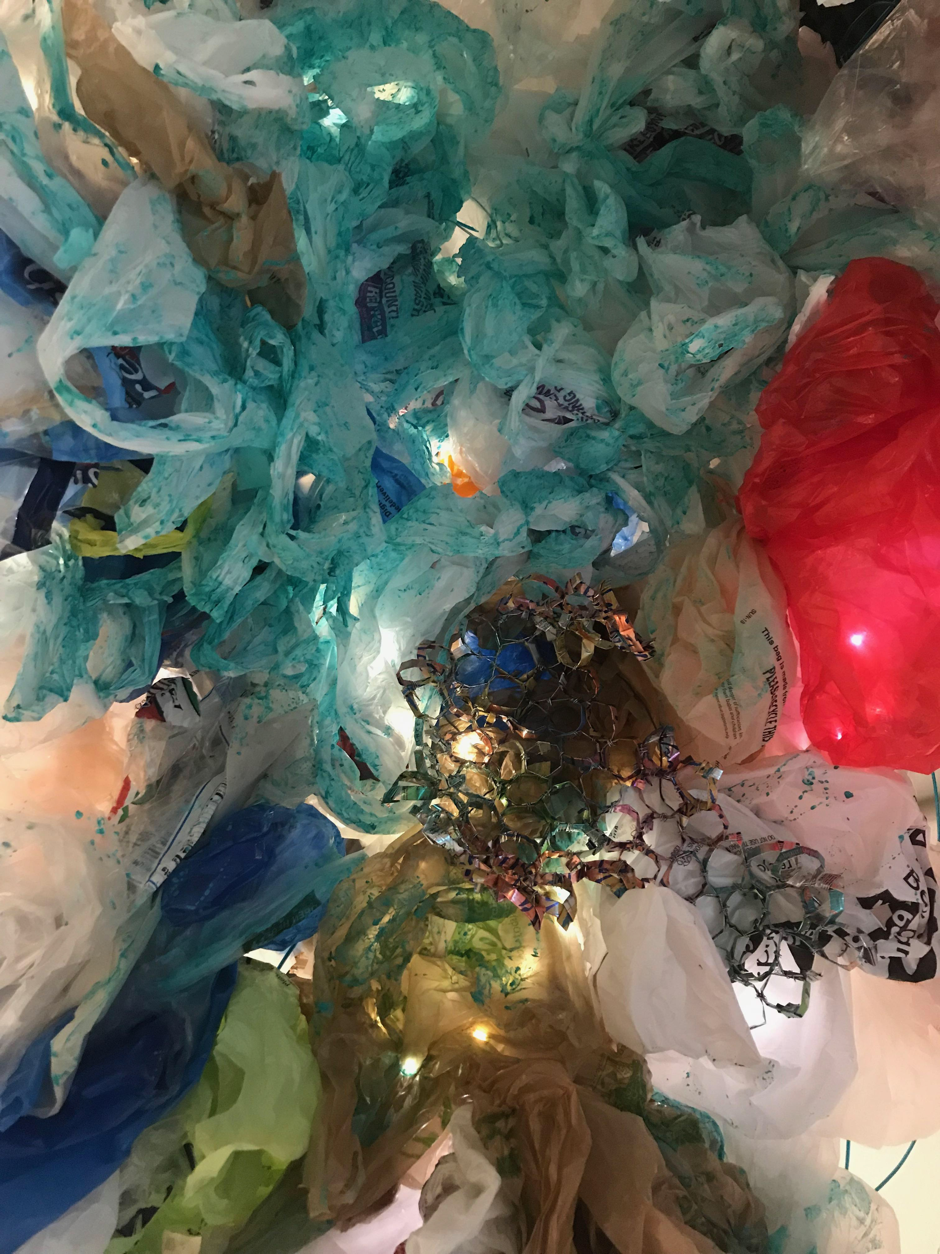 I will create an immersive installation entitled “Waste Knot” using waste materials to transform the Butler Gallery. The scale of the installation will fill the back left corner to create a cavern-like space. Materials will include woven fishing nets, painted plastic bags, recycled Nespresso pods, and illumination to reflect interaction between the colors of the sea and the sun from above.