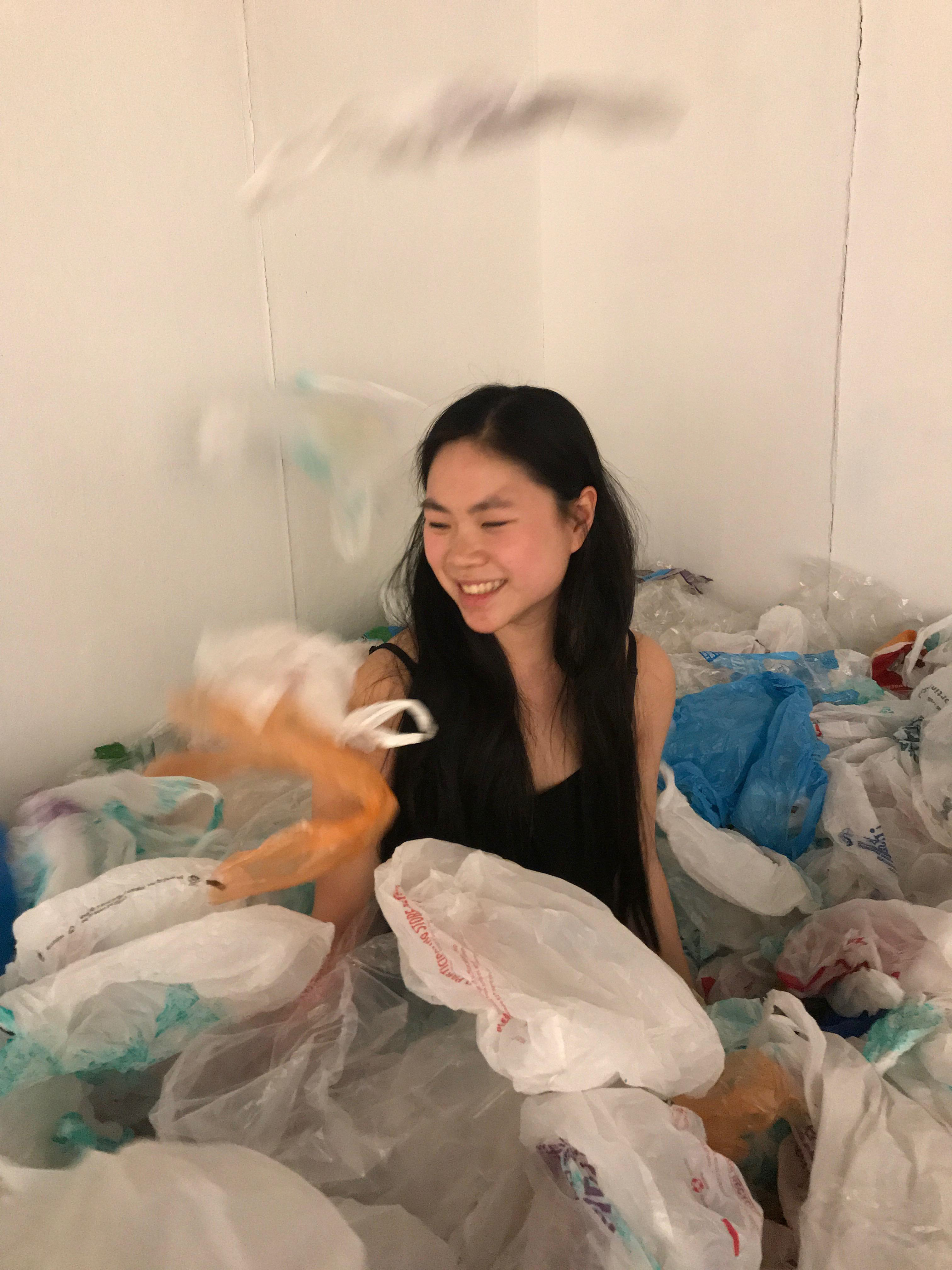 Viewers gazing upwards will feel as if they are under the sea, and the volume of bags is designed to make people experience a sense of compression. My inspiration in exploring this concept stems from my conservation work in Bali and seeing the struggle of ocean pollution and how different cultures approach it.
